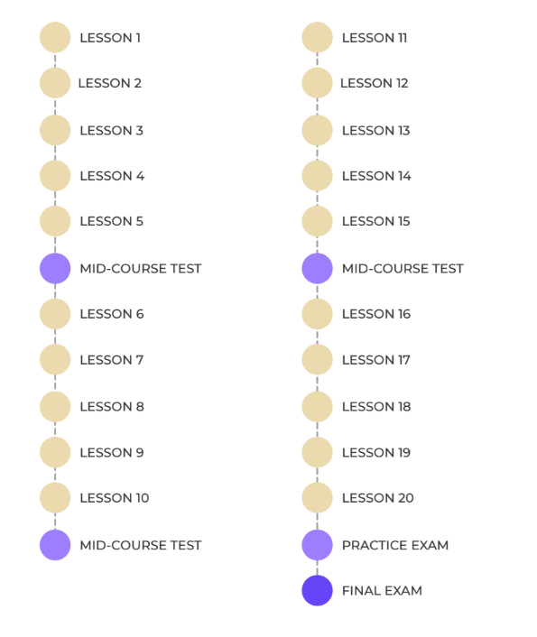 To complete your course, on average, you’ll need to be studying 10-15 minutes per day and completing 1 live online session with your Coach every 2 weeks.